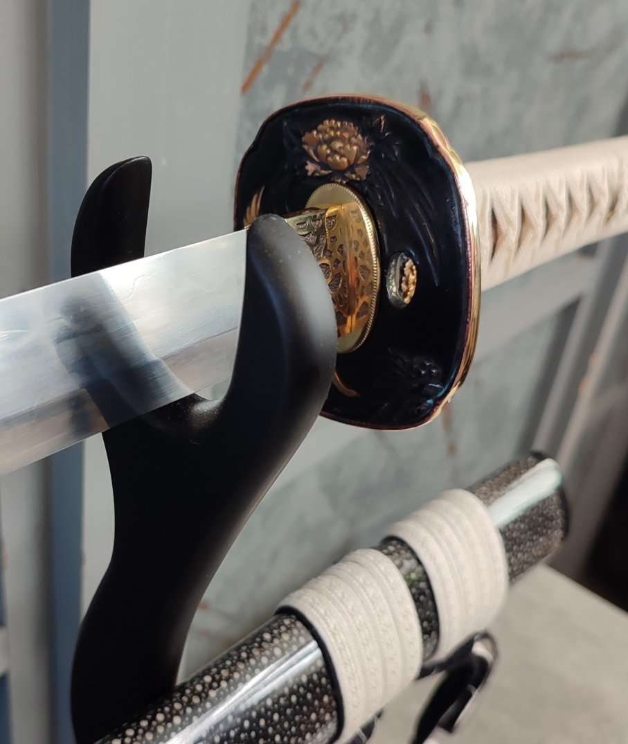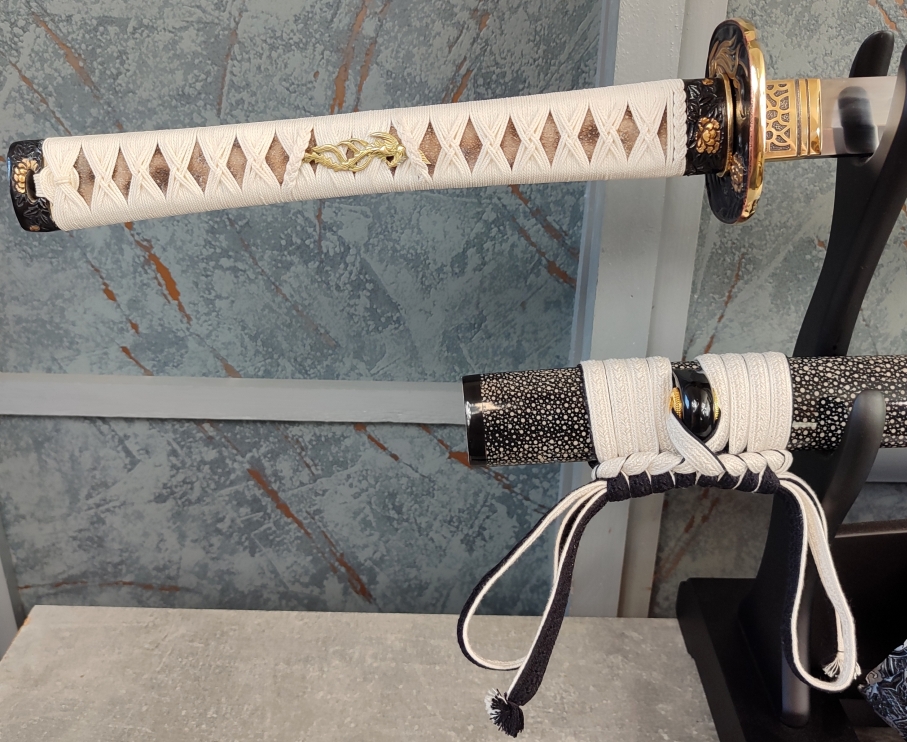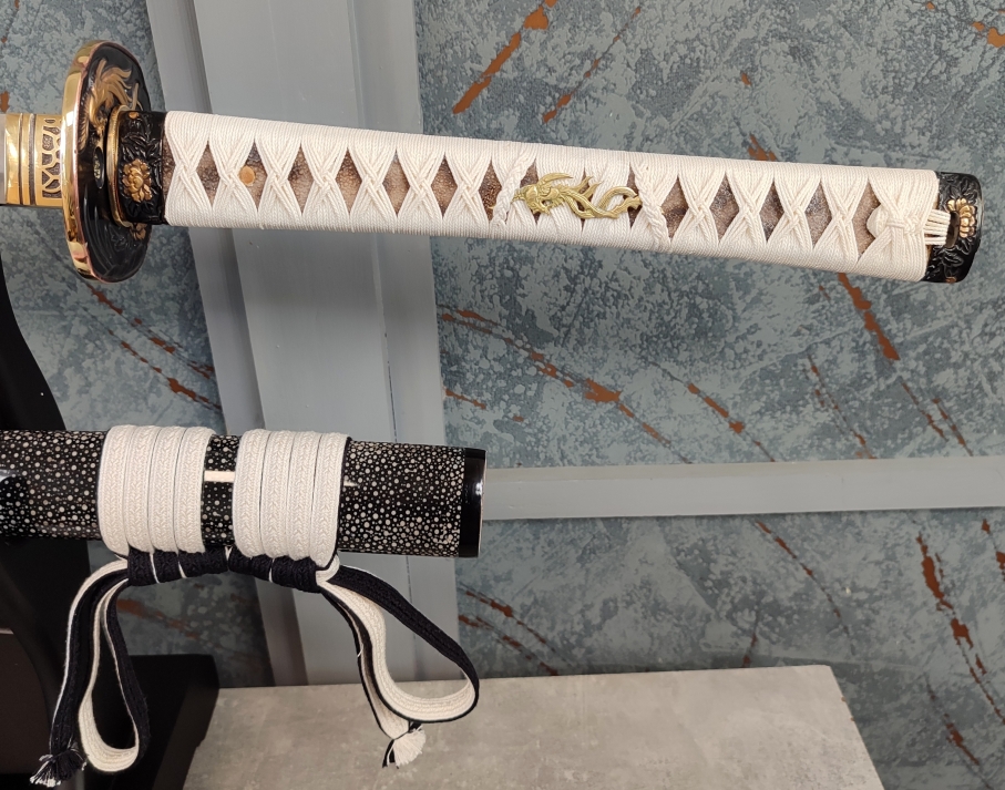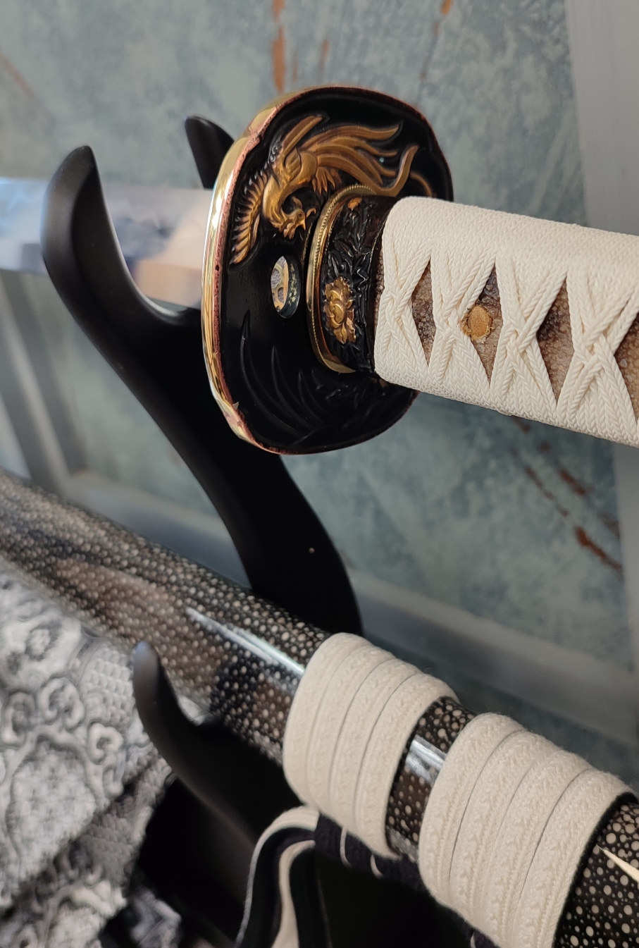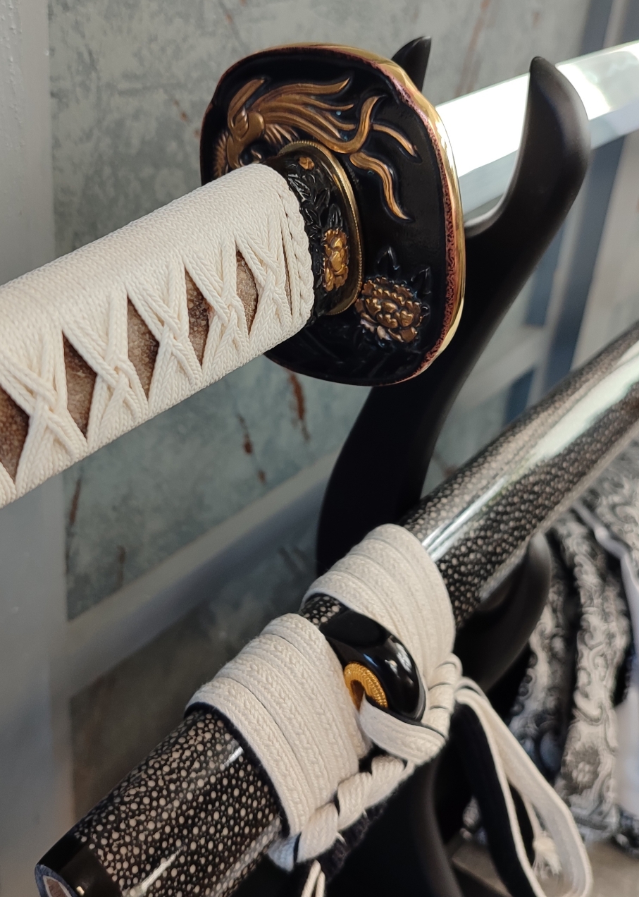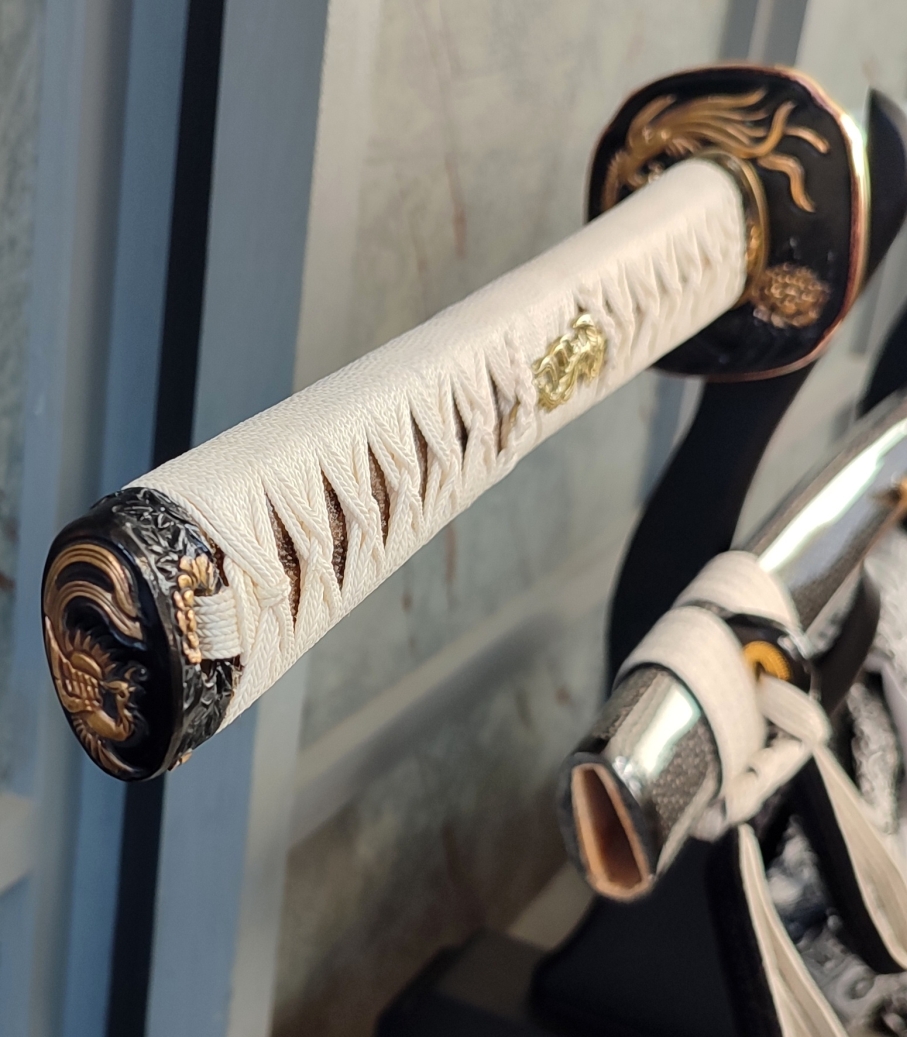Tsuka: Dřevěná rukojeť byla z obou stran potažena kůží ze Rejnoka tygřího a opletena bílou Jabaraito z pravého hedvání, dovezenou z Japonska. Tsukamaki byl následně prolakován pro zvýšení jeho pevnosti a trvanlivosti vzhledu. Fuchi a kashira jsou ve stejném provedení jako tsuba. Na fuchi jsou vyobrazeny pivoňky v kombinaci černé a zlaté, na kashiře pak zlatý fénix, opět na černém podkladu. Menuki jsou opět ve tvaru fénixů, odlitých z mosazi.