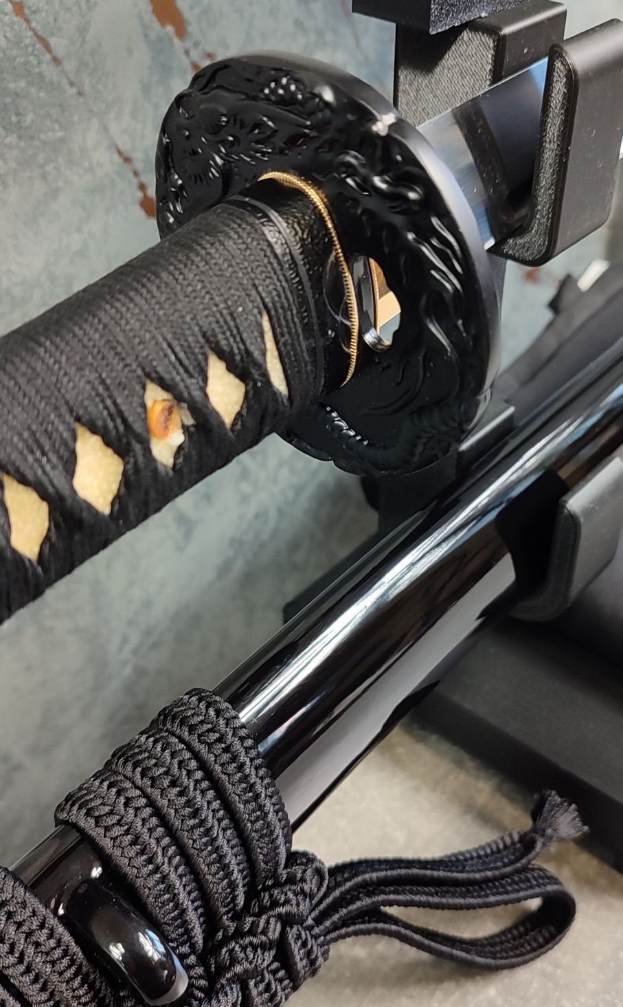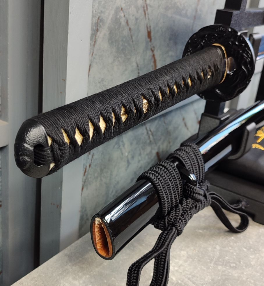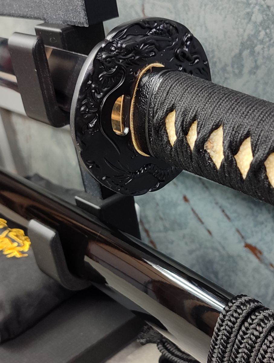 Tsuka: Rukojeť meče je dřevěná a potažená pravou Rejnočí kůží. Původní oplet, taktéž ve stylu hinerimaki byl nahrazen pevnějším opletem, s použitím černé, bavlněné Ito z Japonska od Namikawa Heibei. Po stranách Tsuky jsou menuki ze světlé mosazi, ve tvaru draků, obtáčejících se okolo čepele meče. Fuchi i Kashira jsou masivní, černěné, ocelové odlitky.