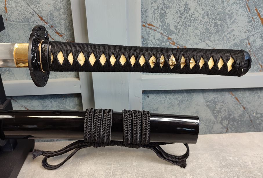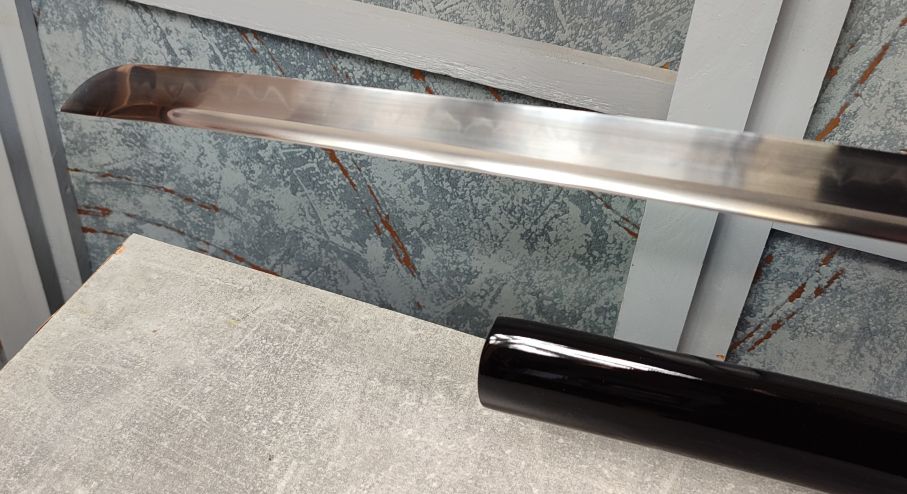 Saya: Pochva je dřevěná, pokryta černým, lesklým lakem. Původní sageo byla vyměněna za sageo z viskózy ve stylu Shigeuchi, dovezenou z Japonska od Namikawa Heibei, která je provlečena dřevěnou Kurigatou bez Shitodome. Koiguchi bylo posíleno proti prasknutí saya.
