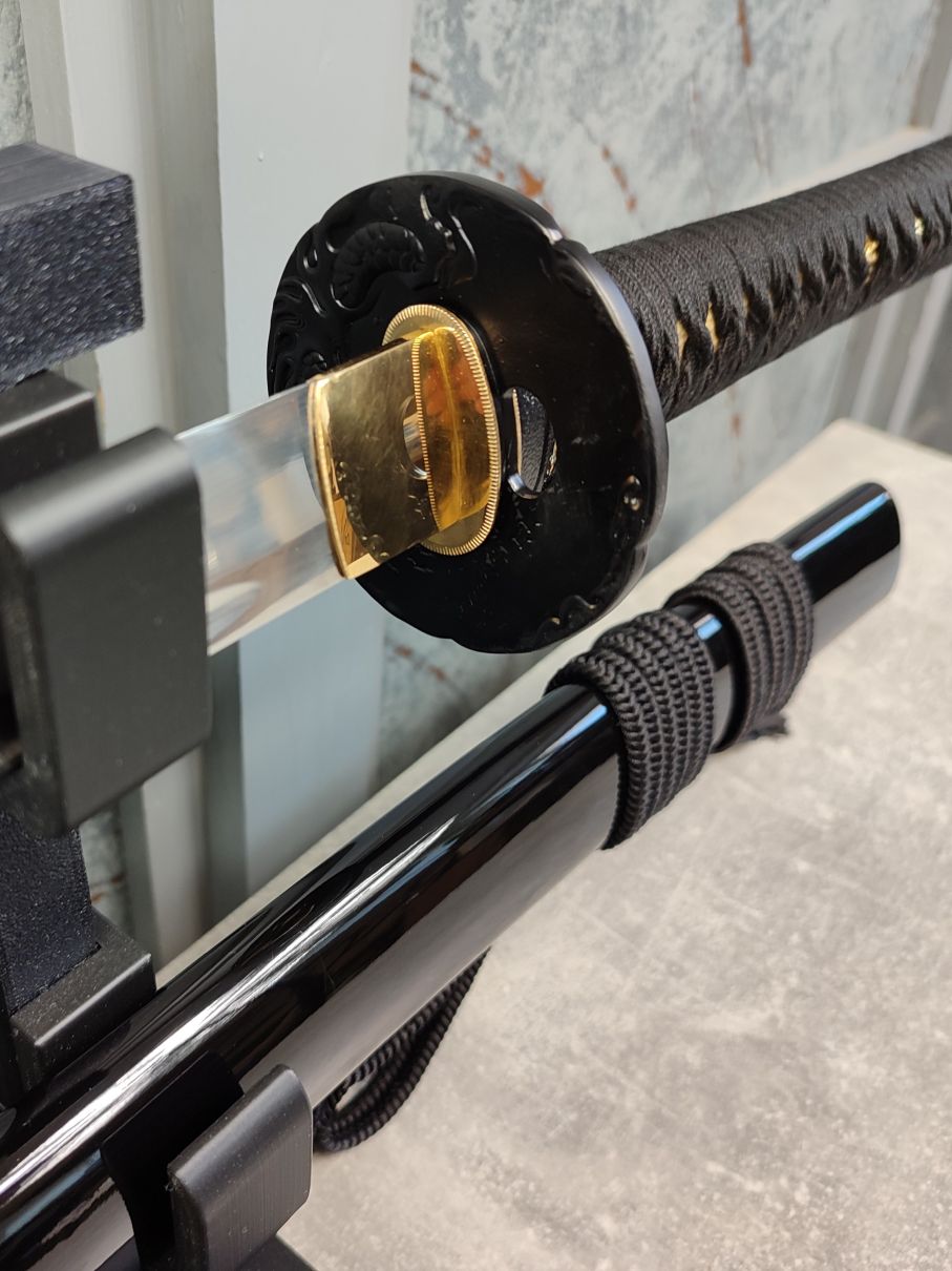Tsuba: Záštita je masívny oceľový odliatok s vyobrazením draka, ktorý sa prelína okrajom tsuby. Na čepeli je zajištěna dvěma mosaznými seppami. Habaki je opět jednoduchý mosazný odlitek.