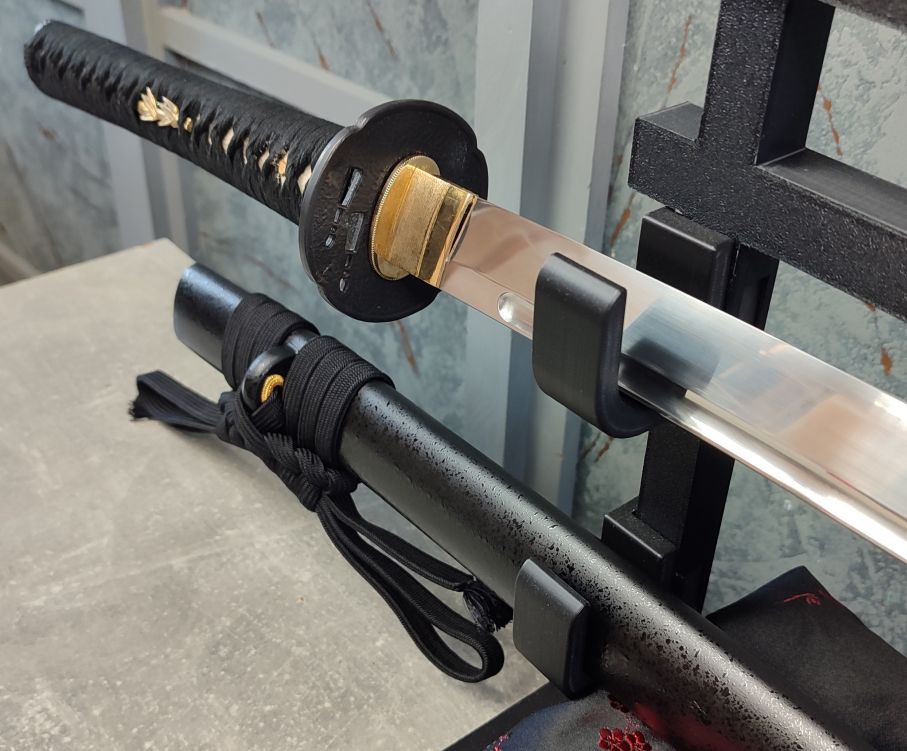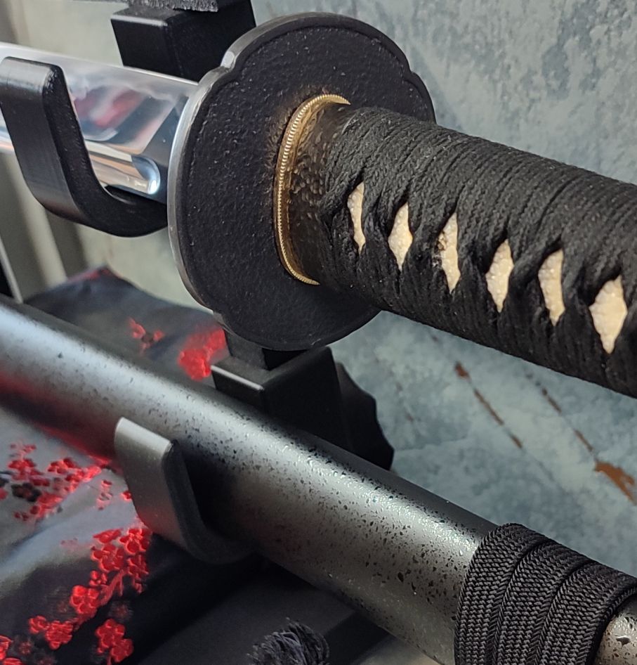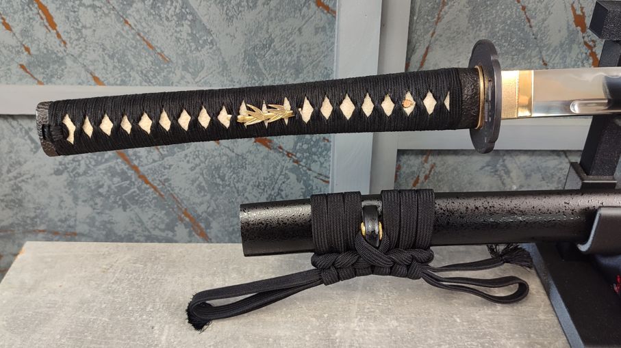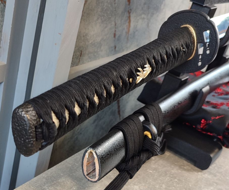 Tsuba: Tsuba je jednoduchý ocelový odlitek ve stylu mokko, s průřezy ve tvaru složených vějířů. Seppy jsou vyrobeny z mosazi, stějna, jako habaki a byly ručně doleštěny.