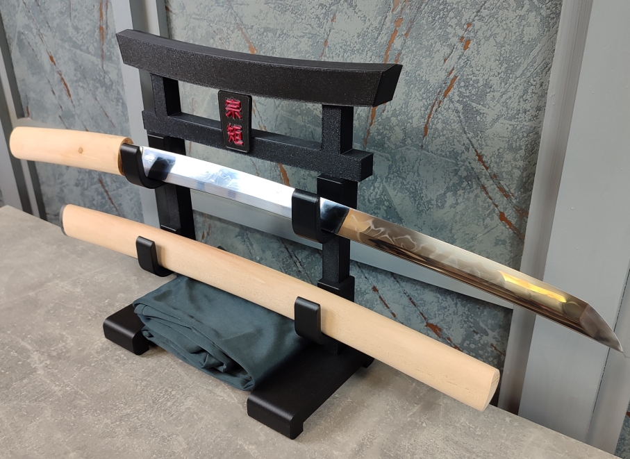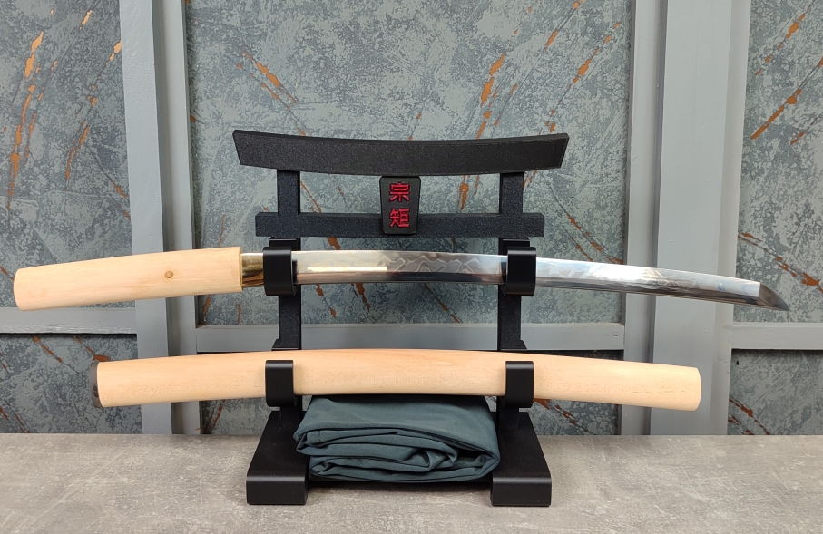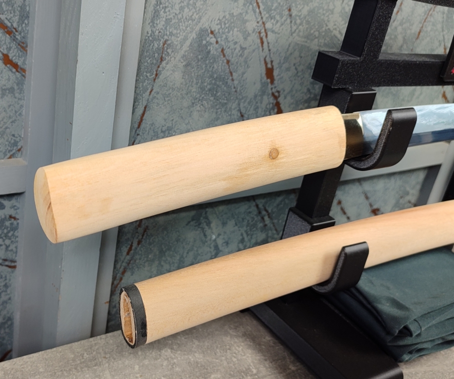 Shirasaya: Takzvaná odpočinková pochva a rukojeť byly vyrobeny ze dřeva červeného dubu a koiguchi posílen proti prasknutí. Čepel je v rukojeti zajištěna jedním bambusovým mekugi.