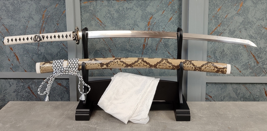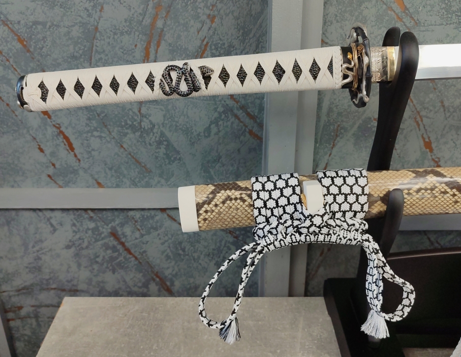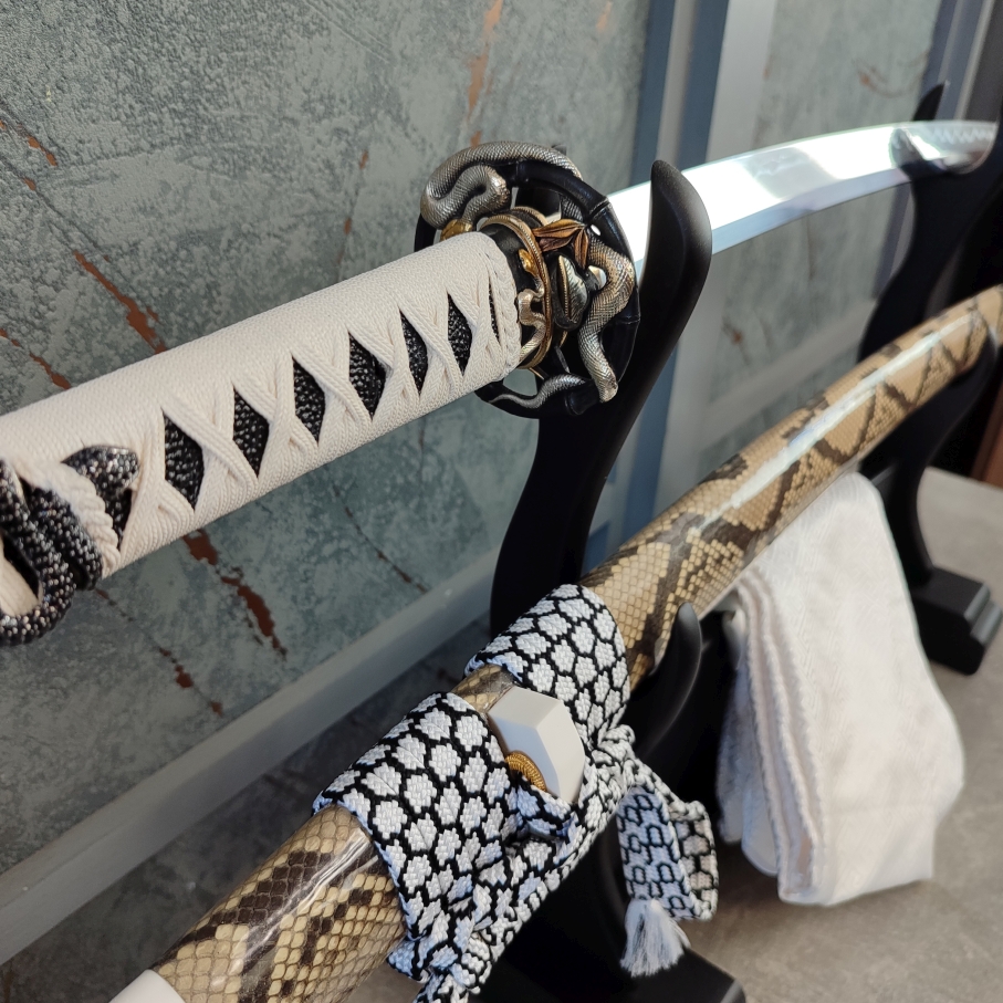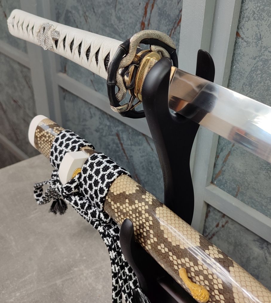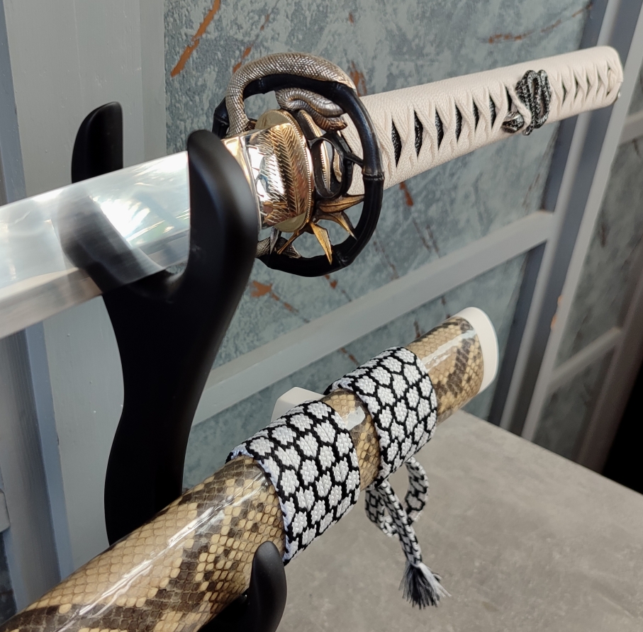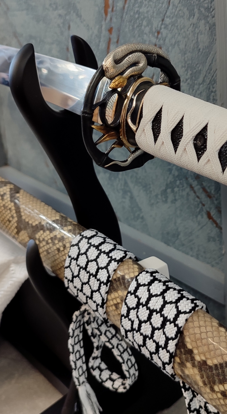 Tsuba: Záštita meče je z mosazi, jakoby upletena z hadího těla. Vybrané prvky jsou zvýrazněny zlatou a stříbrnou barvou. Ozdobný dvojitý habaki byl odlit z mosazi a niklu. Masivní dvojité seppy byly vyrobeny opět z mosazi.