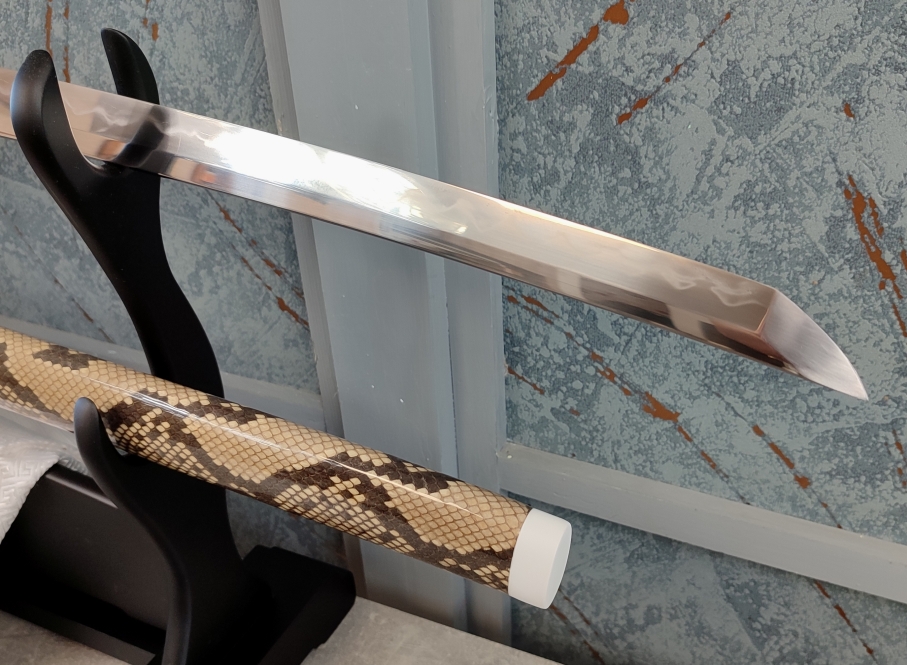 Saya: Saya ze dřeva červeného dubu byla potažena kůží z krajty, poté byla pokryta několika vstvami tvrdého, transparentního laku a následně osazena koiguchi, kojiri a kurigatou z umělé slonoviny (elforyn). Skvělým doplňkem, ladícím s pochvou je pak sageo ze syntetického hedvábí v kombinaci barev bílé a černé, která je uvázána v klasickém stylu. Sageo je ručně pletená šňůra z viskózy ve stylu Kikko, z dílny skupiny GORIN. Přibližně v jedné třetina byl na pochvu přídán háček Kaerizuno z mosazi, motivem draka.