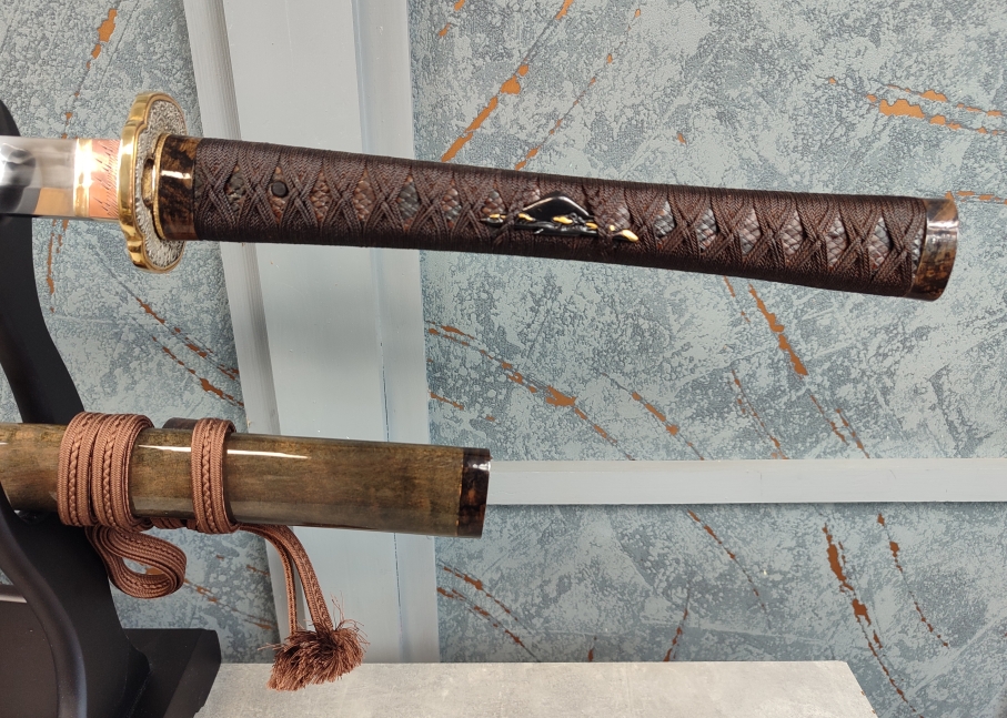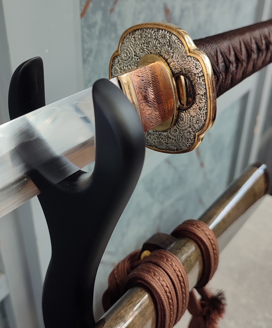 Tsuba: Masivní mosazná záštita ve tvaru mokko ja jakoby pokryta detailně vyobrazenými květy chryzantém. Dvoudílný prstenec habaki byl vyroben z kombinace mosazi a mědi a následně vyleštěn, stejně jako mosazné seppy, zajišťující tsubu na nakago proti pohybu.