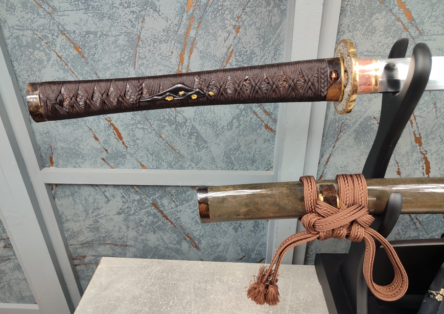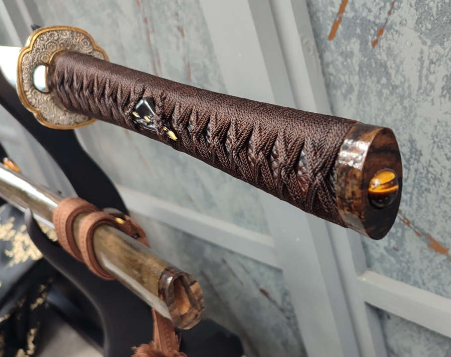 Tsuka: Dřevěná rukojeť byla z obou stran potažena kůží z krajty mřížkované, která byla mořena do hnědé barvy. Následně byla opletena prostřednictvím jabaraito z Japonského hedvábí, ve stylu ajirokumiagemaki a tsukamaki několikrát prolakován pro zvýšení jeho pevnosti a trvanlivosti vzhledu. Fuchi a kashira jsou opět ze dřeva ziricote. Stejně jako saya byly osazeny menšími tygřími oky a dokonale tak ladí s dalšími částmi koshirae. Menuki jsou mosazné, s vyobrazením hor v černé barvě, na jejichž úpatích rostou malé, zlaté květy.