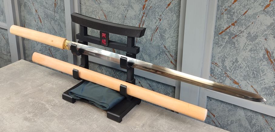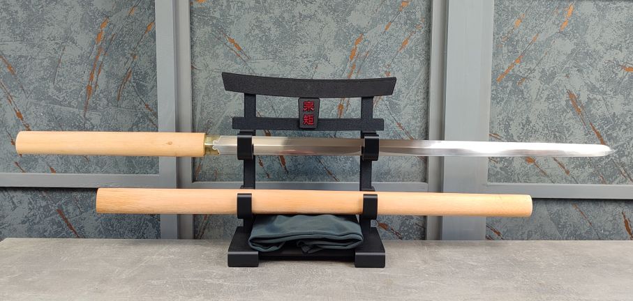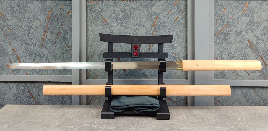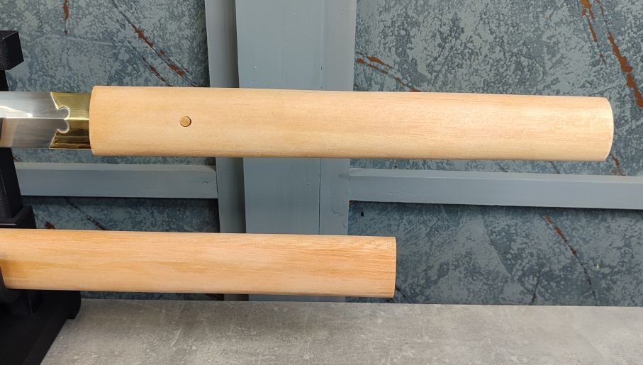 Shirasaya: Takzvaná odpočinková pochva a rukojeť byly vyrobeny ze dřeva červeného dubu. Čepel je v rukojeti zajištěna jedním bambusovým mekugi.