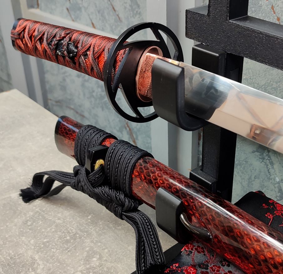 Tsuba: Záštita byla vyrobena z černě lakované oceli ve stylu sukashi. Dvojité seppy jsou měděné a ručně doleštěné, stejně jako dvojitý habaki z kombinace mědi a mosazi.