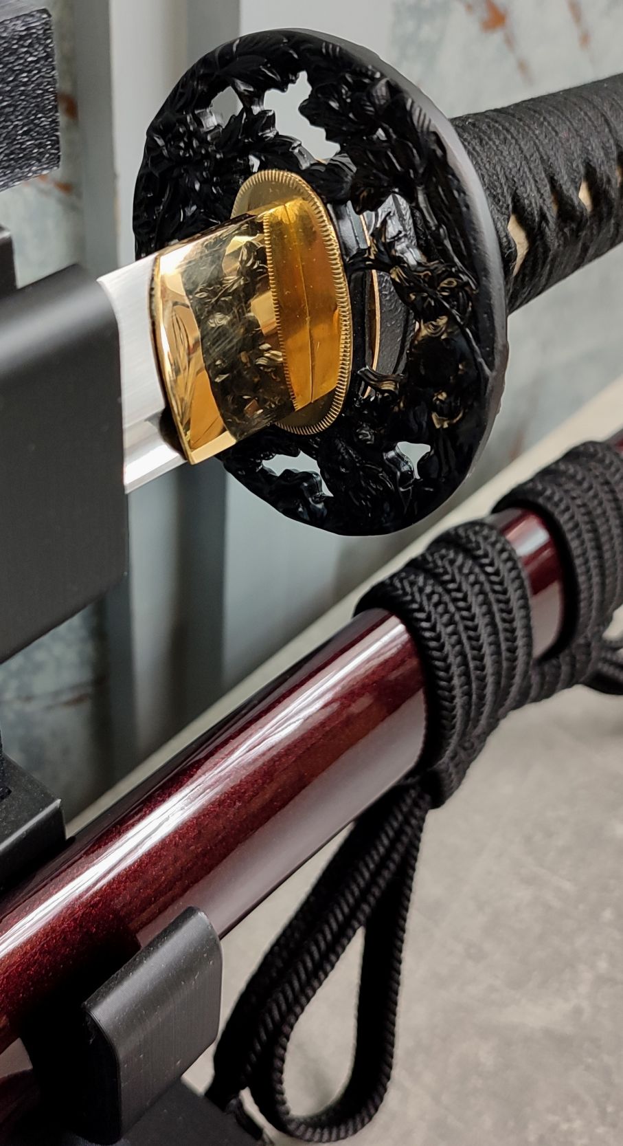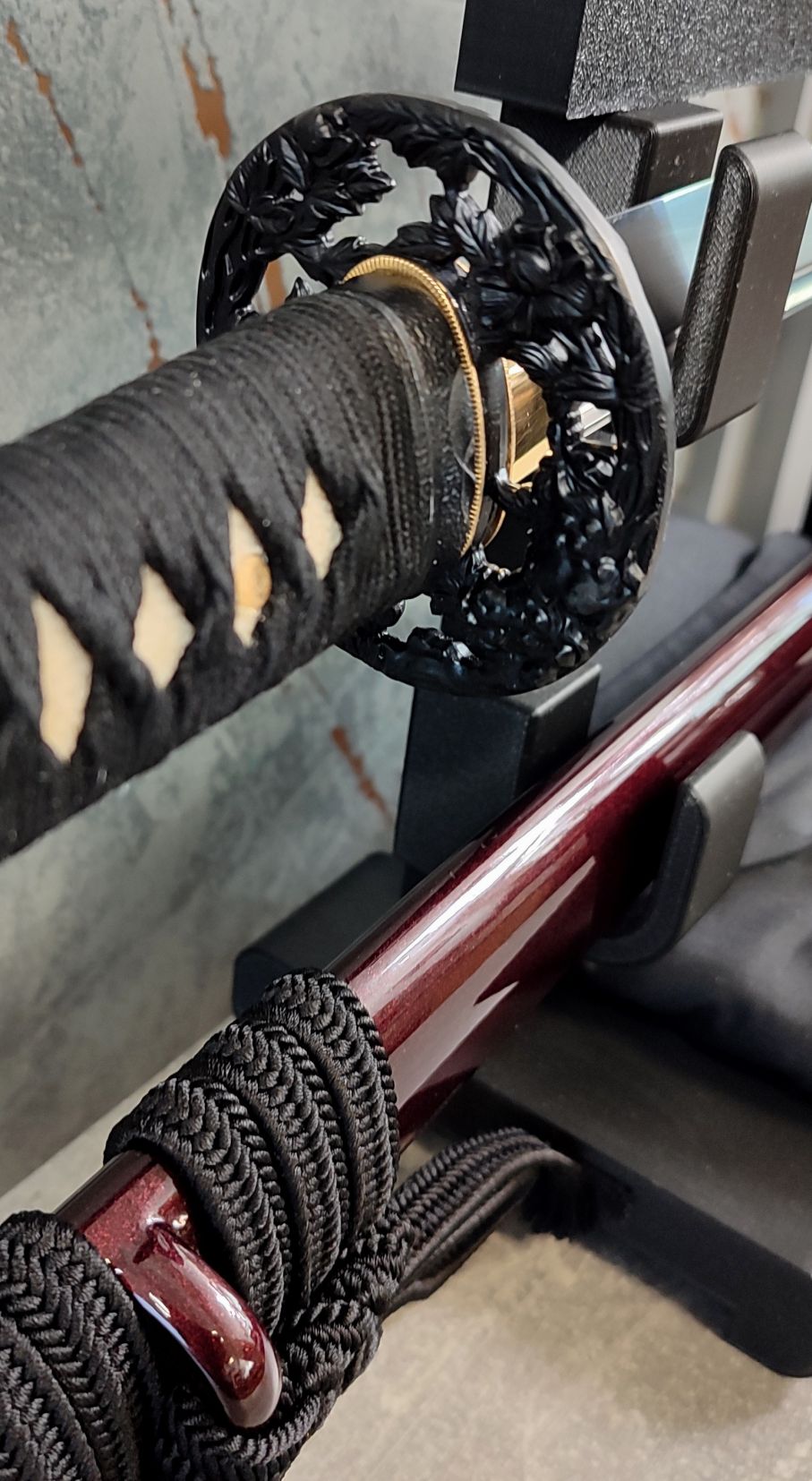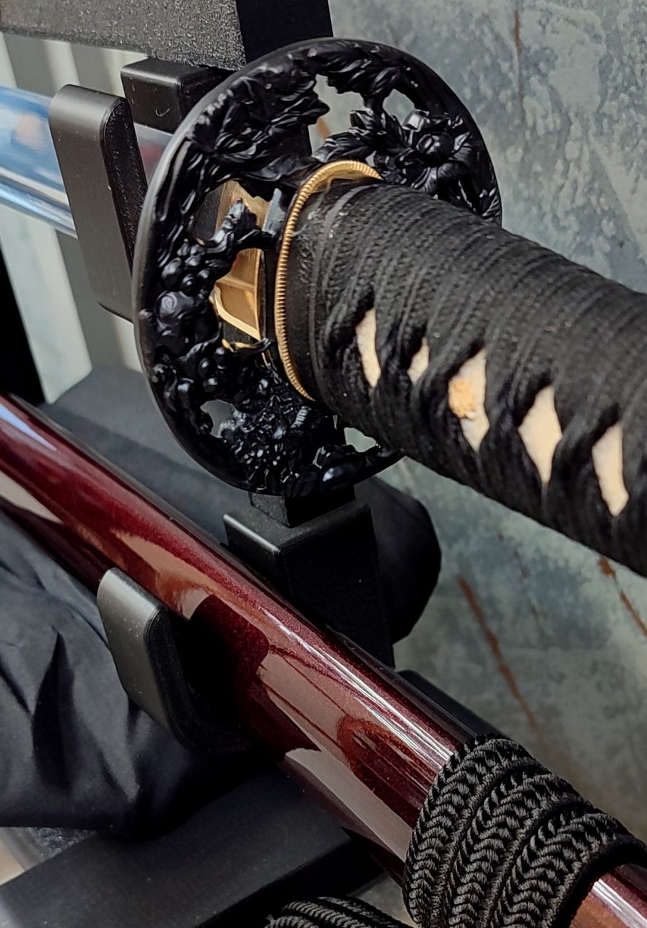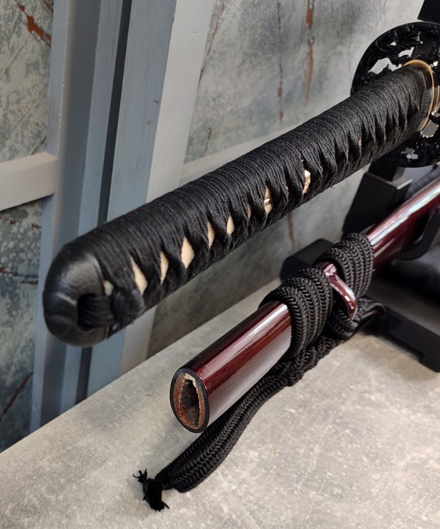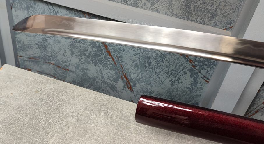 Saya: Pochva je dřevěná, pokryta vínově červeným, metalickým lakem. Původní sageo byla vyměněna za sageo z viskózy ve stylu Shigeuchi, dovezenou z Japonska od Namikawa Heibei, která je provlečena dřevěnou Kurigatou bez Shitodome. Koiguchi bylo posíleno proti prasknutí saya.